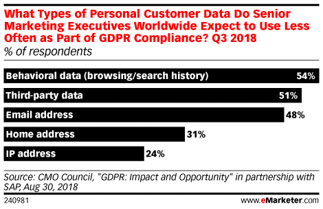 Quali sono i dati più esposti alle nuove norme del GDPR in ambito marketing digitale? Un’indagine condotta nel terzo trimestre 2018 su un campione di 227 dirigenti senior di area marketing da CMO Council e SAP evidenzia che il 54% degli intervistati non userà più i cosiddetti “dati comportamentali” degli utenti raccolti dalla navigazione del browser e dallo storico delle ricerche su motori di ricerca online per non correre il rischio di incorrere in violazioni del GDPR.