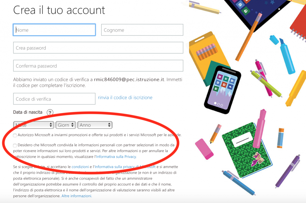 Perché Microsoft, nella pagina di creazione del profilo per gli studenti e docenti, non cancella queste opzioni, che distrattamente ed in modo non consapevole possono essere spuntate? Almeno durante lo stato di emergenza del COVID-19. Le opzioni sono le seguenti:
