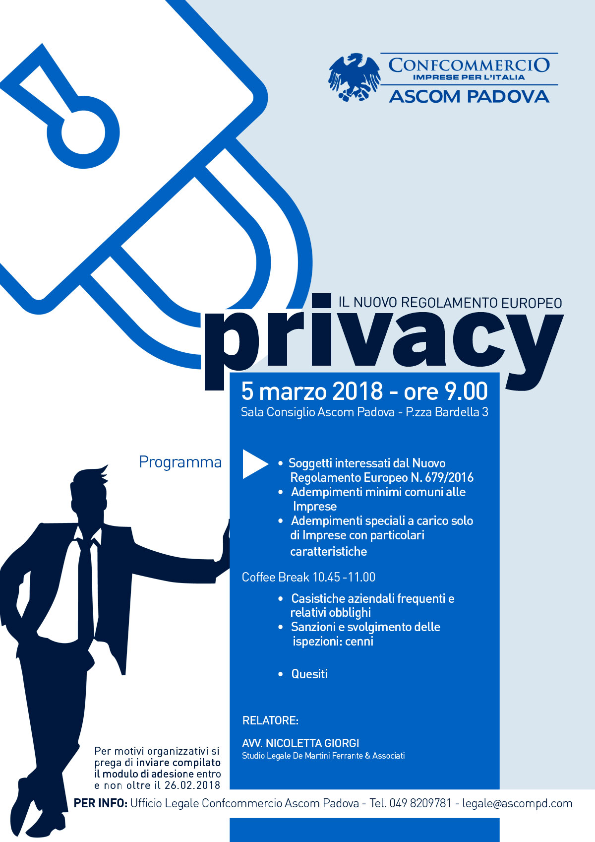 LUNEDI’ 5 MARZO ALL’ASCOM DI PADOVA IL CONVEGNO PER APPROFONDIRE IL NUOVO REGOLAMENTO SULLA PRIVACY.