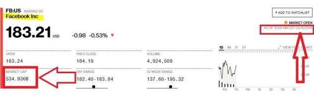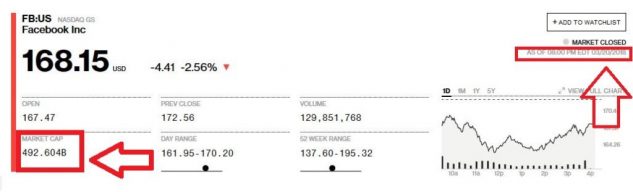 Per lo scandalo Cambridge Analytica Facebook è sotto inchiesta dagli Usa a Uk fino all’Unione europea. E con molta probabilità la società sarà condannata con maxi-multe. In attesa dei verdetti della Federal Trade Commission (FTC), dell’autorità indipendente Uk Information Commissioner’s Officer (ICO) e della Commissione parlamentare britannica fino a quello del Parlamento europeo, vogliamo porre l’attenzione su una ‘sanzione’ che è stata già inflitta non da un’Autorità regolatoria, ma dalla Borsa e dagli utenti stessi del social network. È il danno reputazionale o d’immagine. Questo dovrebbe far più paura a società ed Enti rispetto alle sanzioni, spesso irrisorie, per la violazione della privacy degli utenti. Mark Zuckerberg l’ha capito solo in questi giorni sulla propria pelle, meglio sulle proprie azioni. In una settimana a Wall Street Facebook ha bruciato 42 miliardi di dollari. Il suo market cap è passato da 534.936 Billion $ (Key4biz ha fatto questo screenshot il 15 marzo la vigilia dell’uscita delle inchieste del New York Times e dal Guardian), a 492.604 Billion $, il valore di questa mattina.