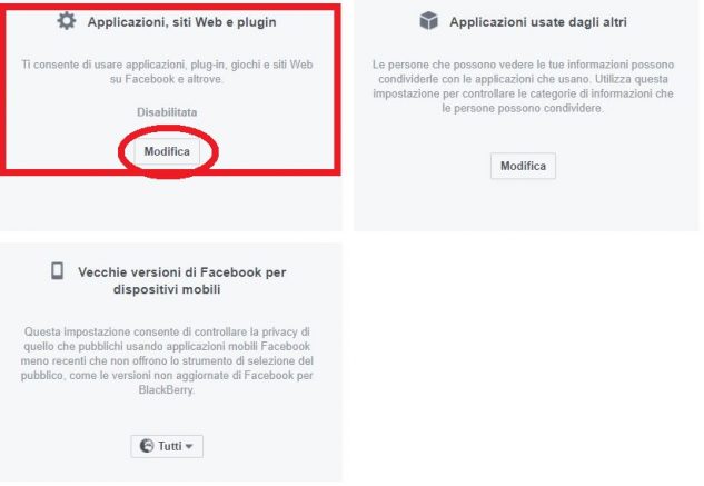 Basta cliccare qui Settings Menu > Apps e poi selezionare “modifica” sotto la voce “Applicazioni, siti Web e plugin”. Nella nuova finestra che si visualizzerà cliccando sul tasto “Disabilita piattaforma”, viene impedito l’accesso dei nostri dati su Facebook a siti Web di terzi e alle applicazioni.