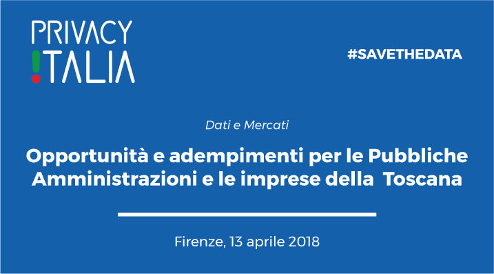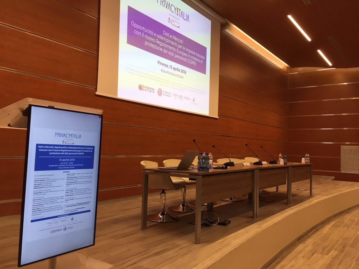 Si è tenuto a Firenze il 13 aprile 2018, presso l’Auditorium della Camera di Commercio di Firenze, il Convegno “Dati e Mercati: Opportunità e adempimenti per le imprese toscane con il nuovo Regolamento Europeo in materia di protezione dei dati personali (GDPR)” promosso dall’Associazione Privacy Italia in vista del Regolamento europeo sulla protezione dei dati personali, che diverrà pienamente applicabile il 25 maggio 2018.