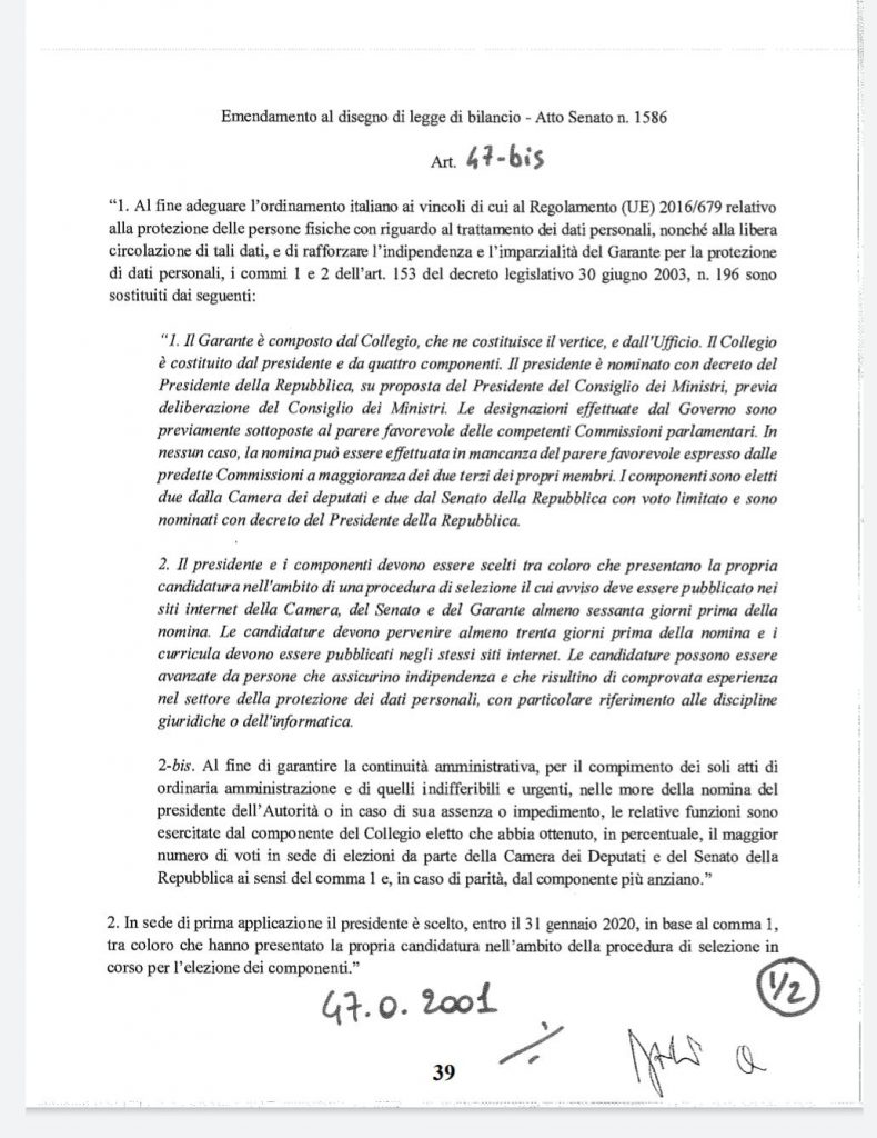 Proteste vittoriose, emendamento bocciato. Non arriveranno con la legge di bilancio le nuove regole sulla governance del garante Privacy né lo slittamento di un mese fino al 31 gennaio 2020 del collegio del Garante e dell’Agcom. L’emendamento dei relatori Accoto (M5S) e Stefàno (Pd) che propone di portare da 4 a 5 il numero dei componenti del collegio è stato giudicato inammissibile per estraneità di materia dalla Commissione Bilancio al Senato, che ha contestualmente bocciato la proposta di allungare di un mese i tempi di vacatio del Garante Privacy e dell’Agcom. Resta quindi il termine del 31 dicembre per la nomina dei nuovi collegi delle due authority.