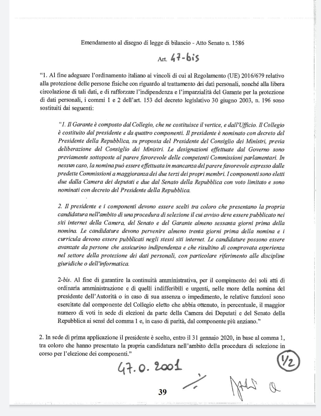 Proteste vittoriose, emendamento bocciato. Non arriveranno con la legge di bilancio le nuove regole sulla governance del garante Privacy né lo slittamento di un mese fino al 31 gennaio 2020 del collegio del Garante e dell’Agcom. L’emendamento dei relatori Accoto (M5S) e Stefàno (Pd) che propone di portare da 4 a 5 il numero dei componenti del collegio è stato giudicato inammissibile per estraneità di materia dalla Commissione Bilancio al Senato, che ha contestualmente bocciato la proposta di allungare di un mese i tempi di vacatio del Garante Privacy e dell’Agcom. Resta quindi il termine del 31 dicembre per la nomina dei nuovi collegi delle due authority.