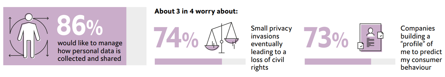 Ricreare una relazione di fiducia tra persone e organizzazioni che possiedono i loro dati è un fattore cruciale. Un recente sondaggio effettuato da ForgeRock su “Che implicazioni avrà l’Internet of Things per la privacy dei consumatori” mostra la grande preoccupazione diffusa tra i cittadini per la propria privacy. L’86% dei consumatori dice infatti di voler controllare quali informazioni personali vengono collezionate automaticamente, il 74% è preoccupato che anche una piccola violazione della privacy potrebbe portare a una perdita dei diritti civili e il 57% è preoccupato dei troppi dati condivisi su Internet.