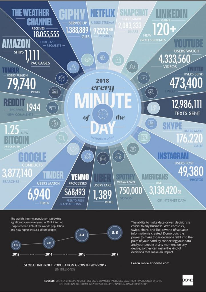 Domo, il sistema operativo basato sul cloud per le aziende, ha pubblicato l’infografica Data Never Sleeps 6.0, il sesto rapporto annuale che offre approfondimenti sul comportamento online dei consumatori condividendo la quantità di dati generati ogni minuto su applicazioni e piattaforme popolari come Google , Twitter, Instagram, Netflix e altro.