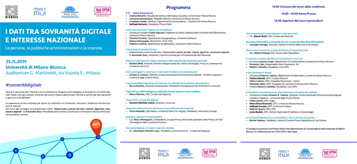 Il Convegno è promosso da Privacy Italia e dal Dipartimento di Giurisprudenza dell’Università di Milano-Bicocca, in collaborazione con Red Open e Asso DPO.
