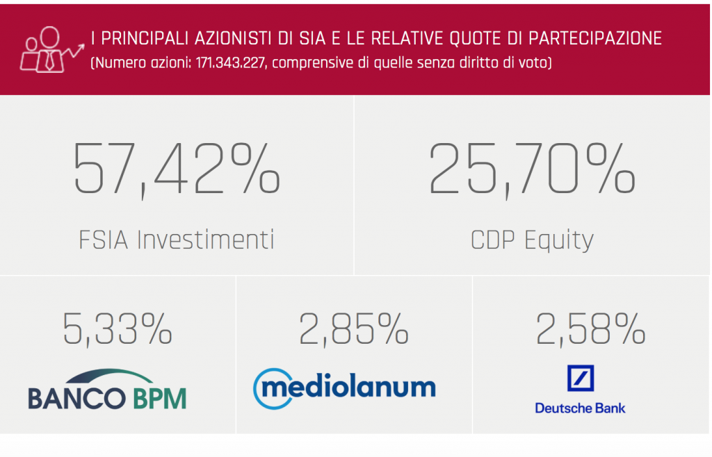 Scrive MF-Milano Finanza è “tra Sogei e Sia la corsa per chi dovrà gestire i dati dell’applicazione”. Sogei è la piattaforma tecnologica dell’amministrazione finanziaria, Sia è la società controllata da CDP Equity, specializzata, si legge sul sito, nella progettazione, realizzazione e gestione di infrastrutture e servizi tecnologici dedicati alle Istituzioni Finanziarie, Banche Centrali, Imprese e Pubbliche Amministrazioni. Sogei la società di Information Technology 100% del Ministero dell’Economia e delle Finanze ed opera sulla base del modello organizzativo dell’in house providing, invece i principali azionisti di Sia sono: 57,42% FSIA investimenti (società posseduta per il 70% da FSI Investimenti – a sua volta controllata da CDP Equity con una quota del 77% – e per il 30% da Poste Italiane), 25,70 Cdp Equity, 5,33 Banco BPM, 2,85% Mediolanum e 2,58% Deutsche Bank.