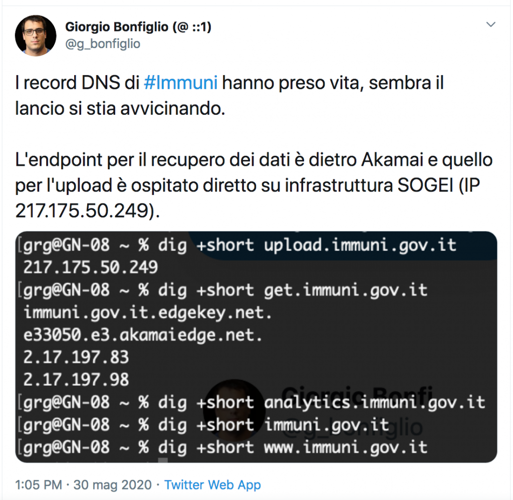 Ivan Visconti. Per quello che sappiamo oggi basterà collegarsi a get.immuni.gov.it e risponderà una Content Delivery Network (CDN) che sarà in grado di offrire un servizio affidabile, limitando quindi i rischi di interruzioni. Le CDN non sono gestite dall’autorità pubblica, al momento sembra che sarà Akamai, che è leader per tali servizi, a rispondere quindi alle richieste delle app che intendono verificare i contatti a rischio. Il fatto che Akamai avrà i dati da inviare alle app conferma che si tratta di dati essenzialmente pubblici, e non ristretti a SOGEI e agli smartphone con l’app. Non c’è da meravigliarsi quindi del fatto che chiunque possa scaricarli, anche senza un’app. Devo dire che oculatamente la fase di upload invece sembra progettata per raggiungere solo i server SOGEI, quindi senza affidarsi ad una CDN. Infatti, tale fase include ulteriori dati sensibili che verosimilmente non saranno inoltrati alla CDN. Sulla decisione di non usare una CDN per la procedura di upload sono d’accordo con la scelta progettuale di Immuni. Ricordo che la relazione del COPASIR aveva espresso perplessità sull’uso di una CDN.