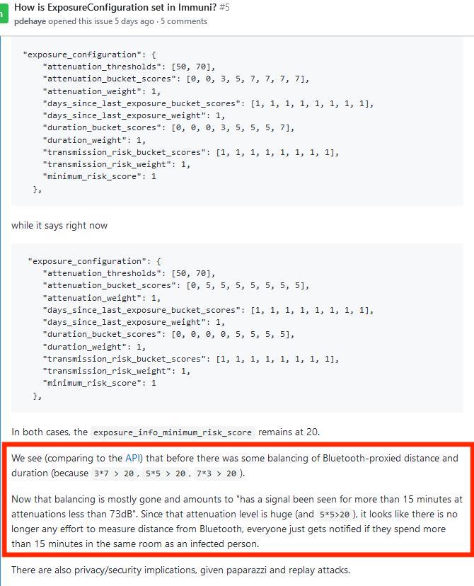 “Come si nota qui, la configurazione dell’app è cambiata durante la notte. Non sembra più esserci alcun tentativo di sfruttare il Bluetooth come proxy per la distanza, contano solo la durata e praticamente tutti i beacon tracciati. C’è stata qualche comunicazione pubblica o spiegazione sull’argomento?”, ha chiesto su GitHub l’utente pdehaye.