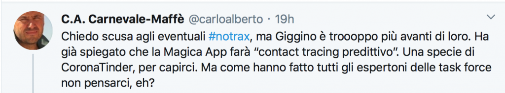 “Chiedo scusa agli eventuali #notrax, ma Giggino è troooppo più avanti di loro. Ha già spiegato che la Magica App farà “contact tracing predittivo”. Una specie di CoronaTinder, per capirci. Ma come hanno fatto tutti gli espertoni delle task force non pensarci, eh?