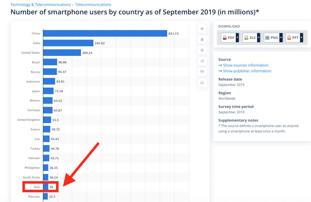 Il 60% degli italiani è pari a 36 milioni di cittadini e 36 milioni è anche il numero di smartphone in Italia, secondo i dati di settembre 2019 qui riportati nel grafico di Statista.