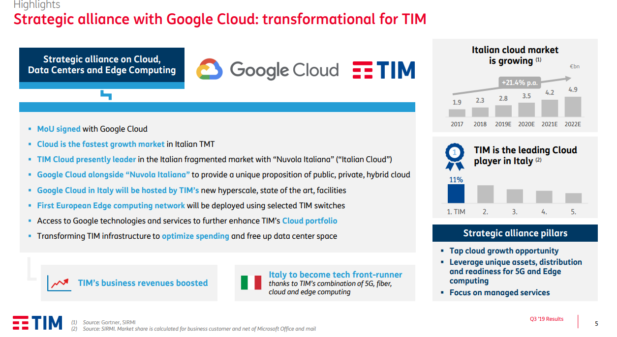 Il mercato del cloud in Italia è atteso in crescita, si legge nella nota di Tim, “trainato dalla domanda di servizi di public, hybrid e edge computing che saranno ulteriormente sostenuti dall’integrazione di nuovi prodotti e applicazioni legate alla tecnologia 5G“.